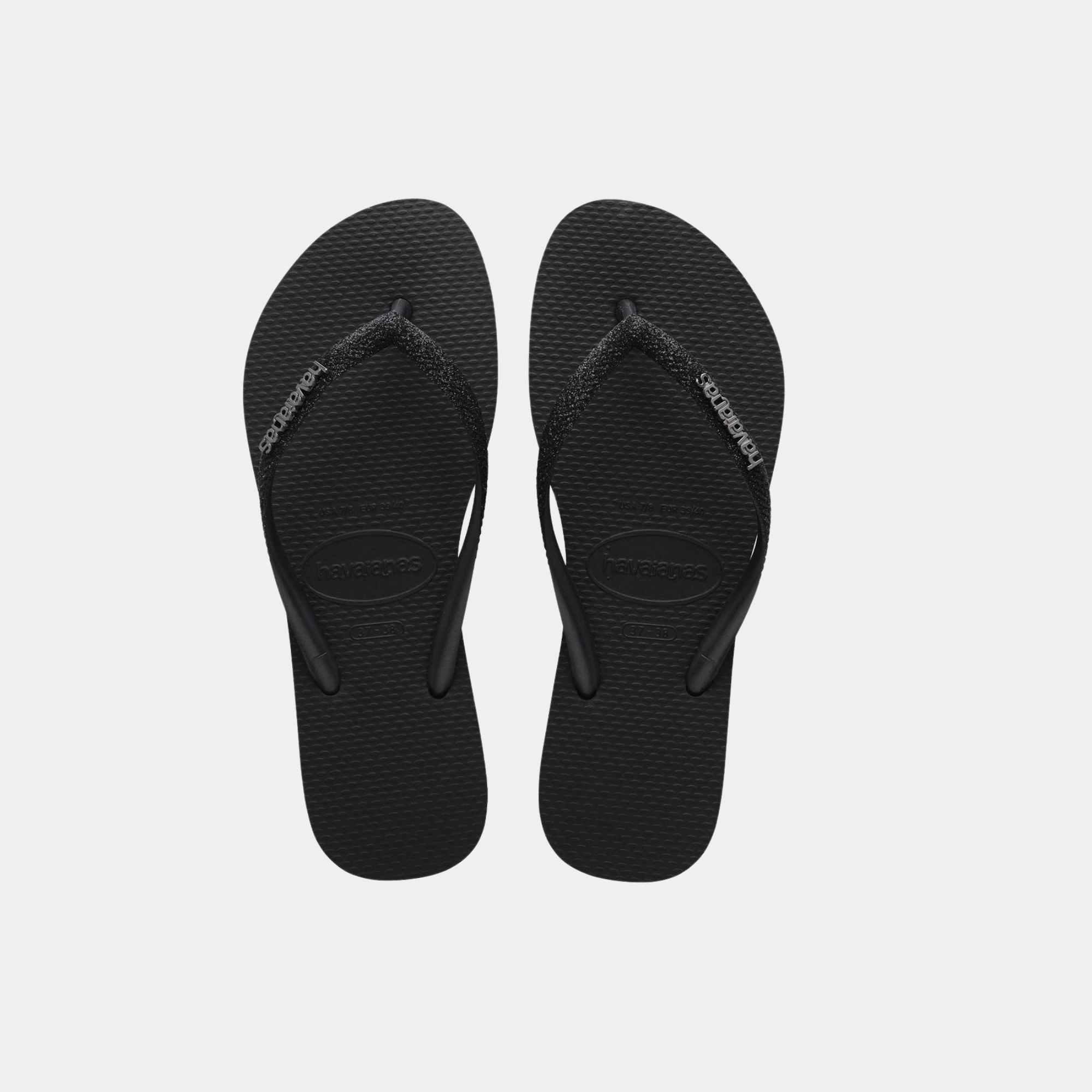 כפכפי אצבע לנשים של הוואיאנס (Havaianas) מדגם Slim בעלי רצועות סינתטיות צרות בגימור מטאלי הכוללות לוגו המותג משובץ אבני חן. הכפכפים עשויים גומי דוחה מים עם...