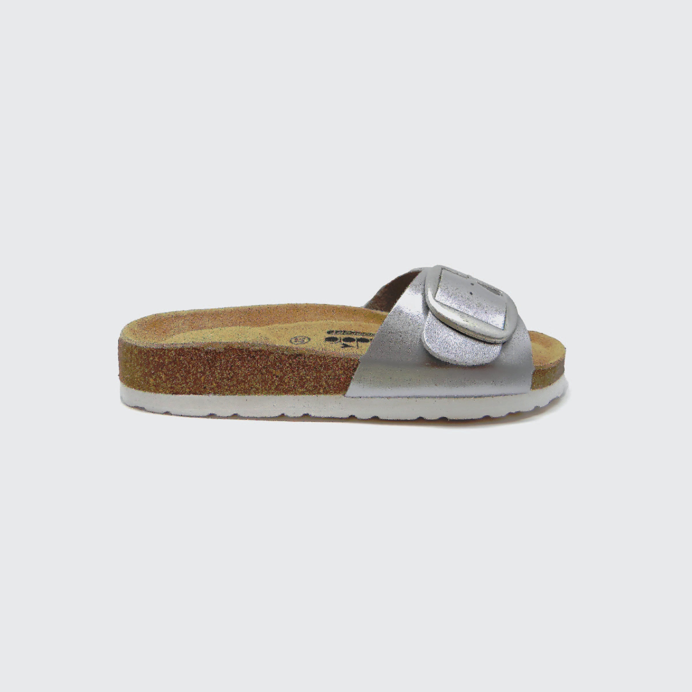 כפכפי נשים מדגם רינה של דיאדורה. הכפכפים בעלות רצועה סינטטית בצבע כסוף עם אבזם וסוליית שעם בסיומת גומי.