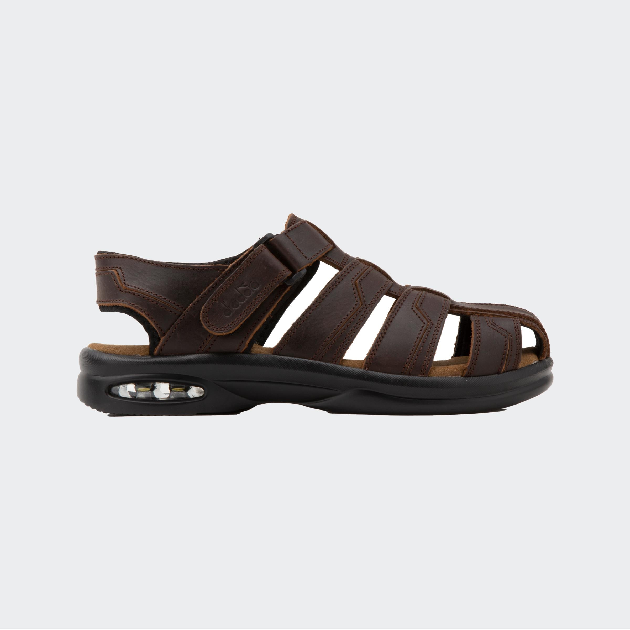 סנדלי גברים דגם טרילר של דיאדורה. גפת הנעל בעלת רצועות עם פתחים בצדדים וסקוץ להידוק וחיזוק עם לוגו המותג עליו. סוליית הנעל עשויה גומי בצבע שחור.