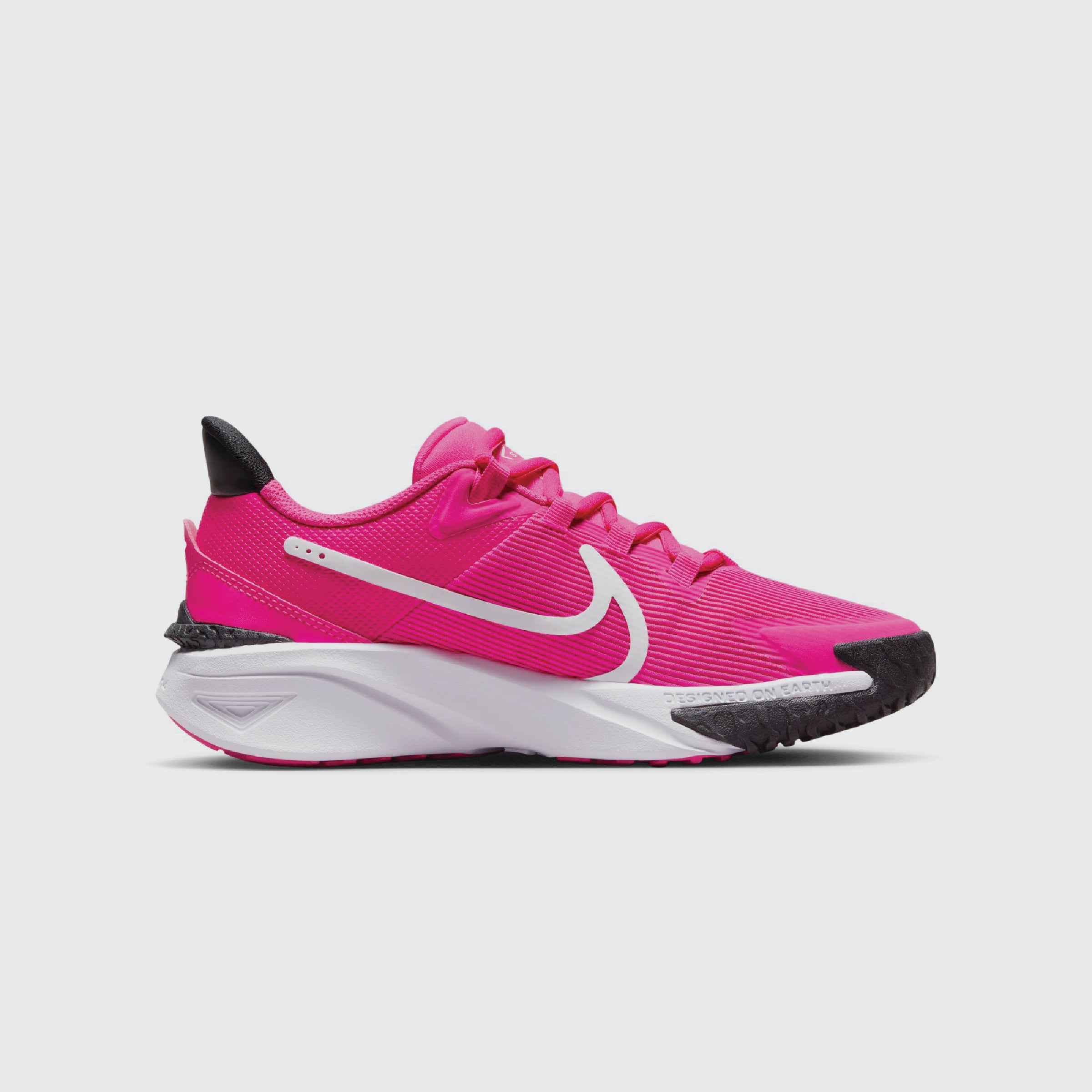 נעלי ספורט ילדות Star Runner 4 של נייק. גפת הנעל עשויה בד בשילוב טקסטורות חומרים שונות. לוגו המותג בצידי הנעל והסוליה עשויה גומי.